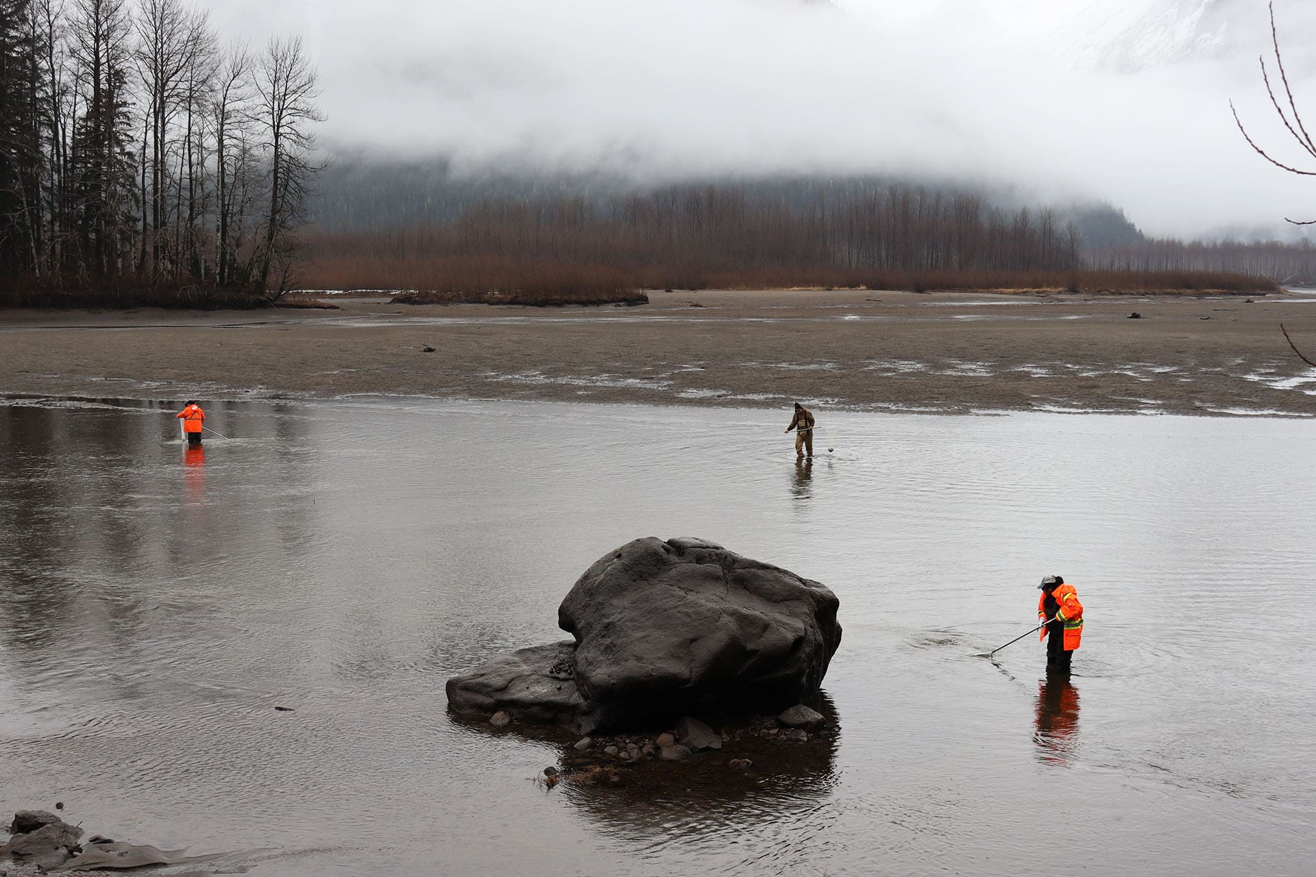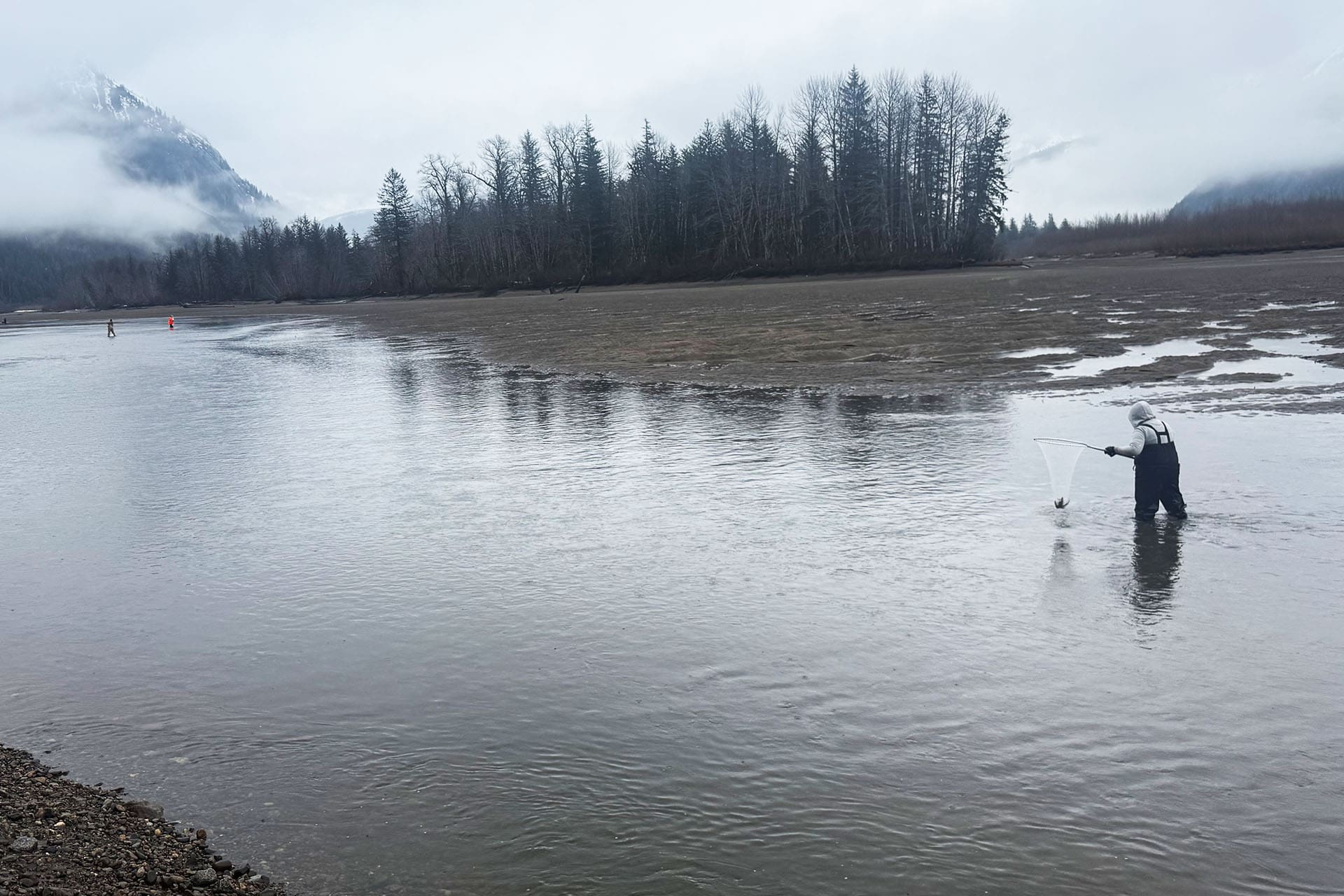 A small parking area sits just off the highway, and when we arrived several vehicles were already parked. Local fishers were preparing their nets and waders, heading into the shallow water to harvest oolichan. One thing we quickly noticed was the strength and determination required to fish for these small but abundant fish. As Allison observed while watching from the shore: