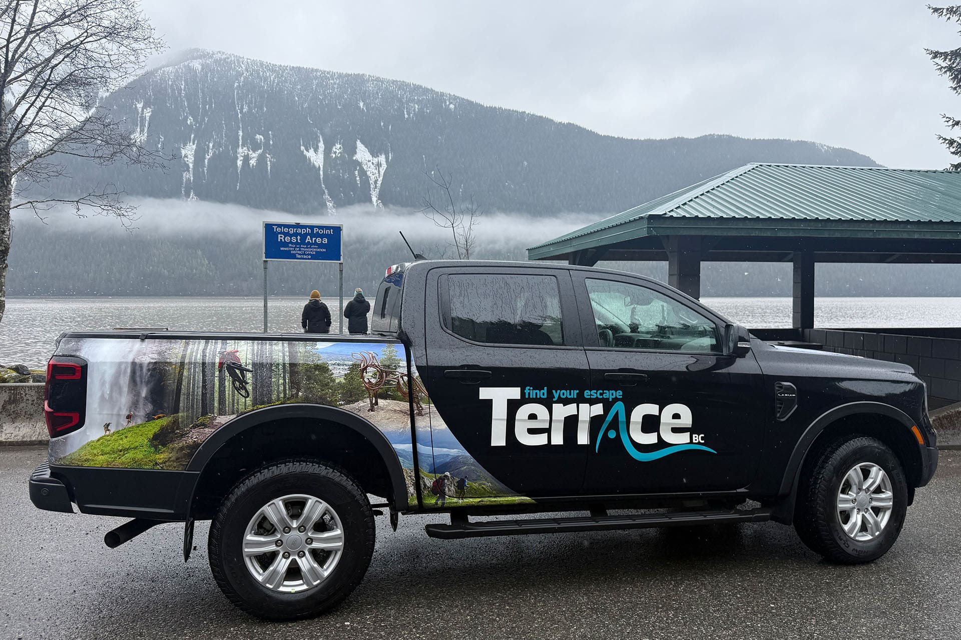 Our first landmark was the turnoff to Shames Mountain, a beloved local ski hill that we would later return to for lunch. Not long after, we passed the Exstew Rest Area and the road leading to Exstew Falls. Seeing the sign brought back memories of previous visits. Exstew Falls is a beautiful waterfall tucked up a forest service road. While it can technically be visited year-round, the best access is usually late spring through fall (May–October) when road conditions are more reliable and glacier runoff makes the falls especially powerful. If you’re exploring this region, it’s definitely worth adding to your list.
